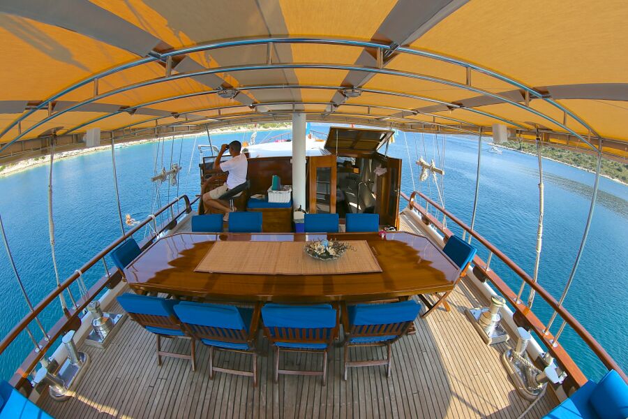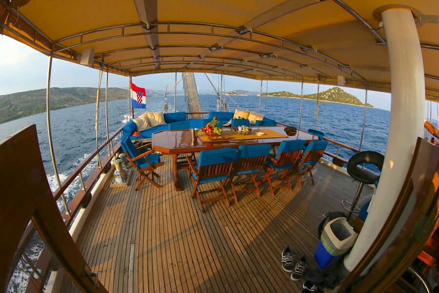 The most beautiful part of the gulet is very large and spacious deck. Stern deck is completely shaded and is perfect dining area, furnished with big dining table with chairs, as well as very comfortable leisure sofa, where our guests adore to repose after plentiful and delicious meals.