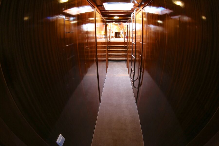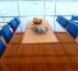 The indoor salon is very spacious, cozy and elegantly furnished, having a large couch with dining table and chairs, as well as the yacht bar. The salon is equipped with TV and music system. Large panoramic windows allow much of a daylight.