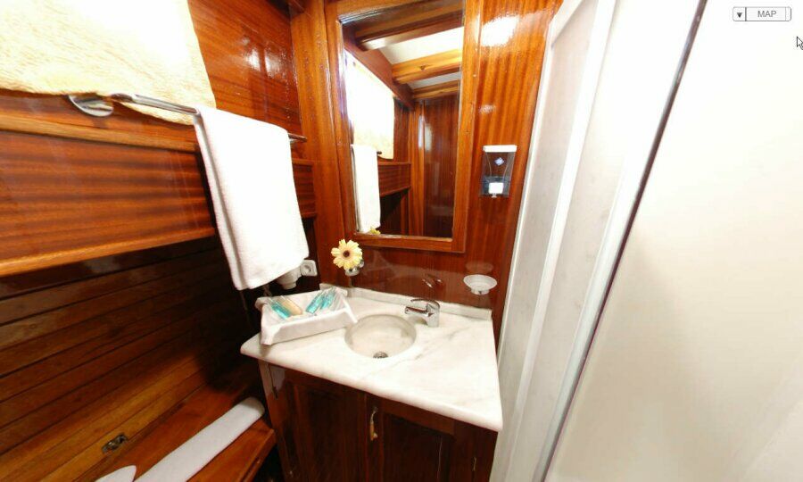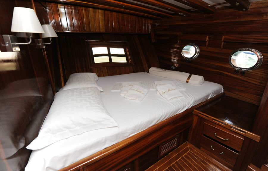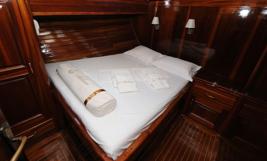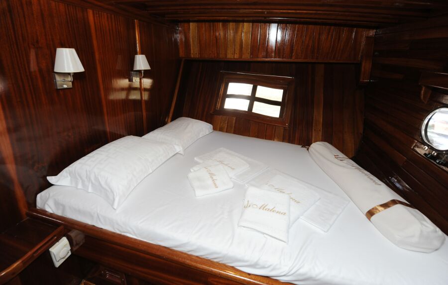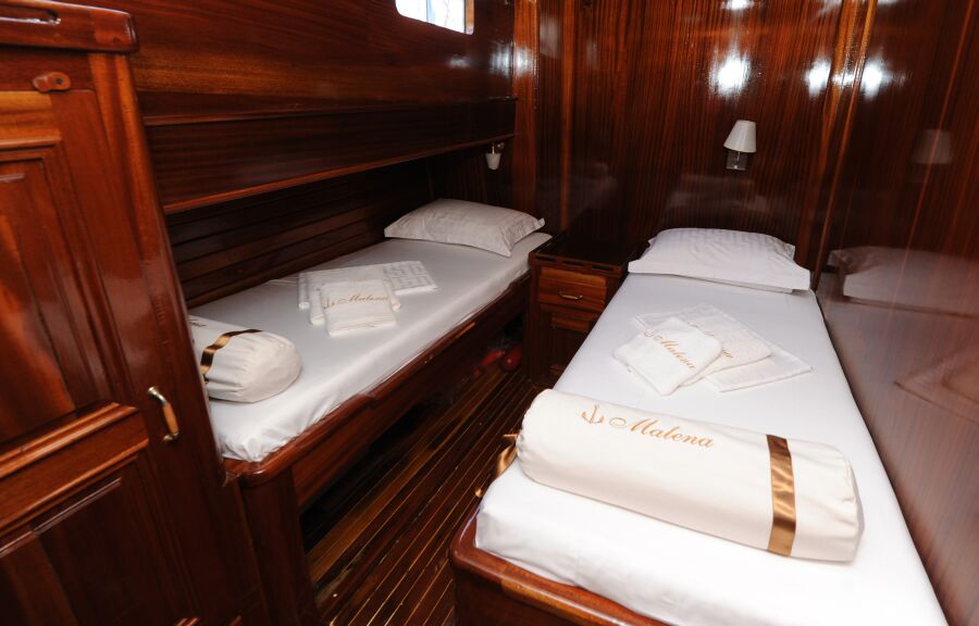 Malena has 6 CABINS to accommodate up to 12 GUESTS. All the cabins are air conditioned and have en suite toilet with shower tub and all necessary toiletries (shower gel, hair dryer).