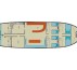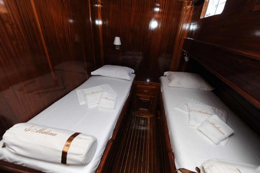 In bow there are 2 cabins with queen size beds and 2 cabins with twin beds, while in stern there are 2 cabins with queen size beds.